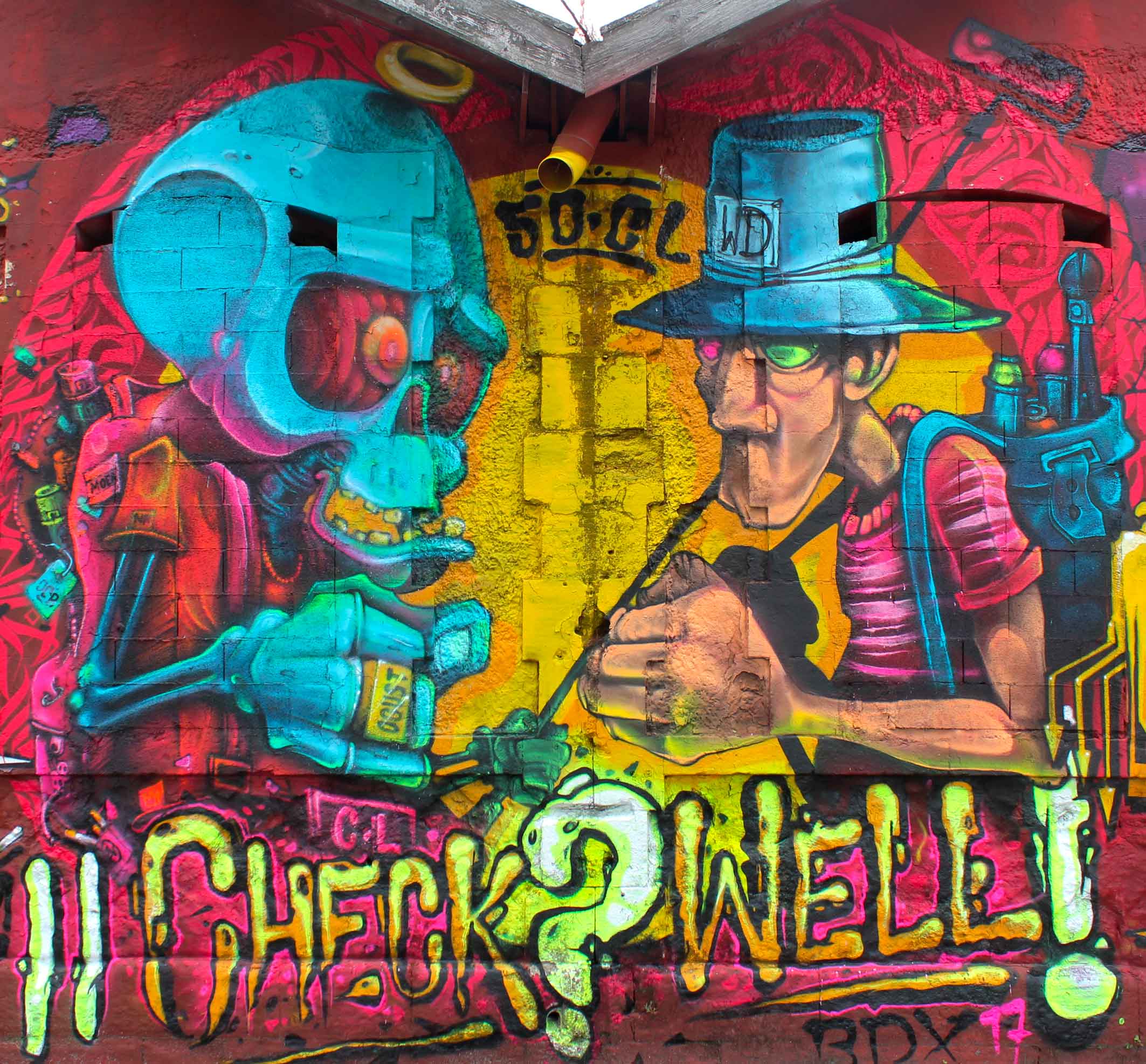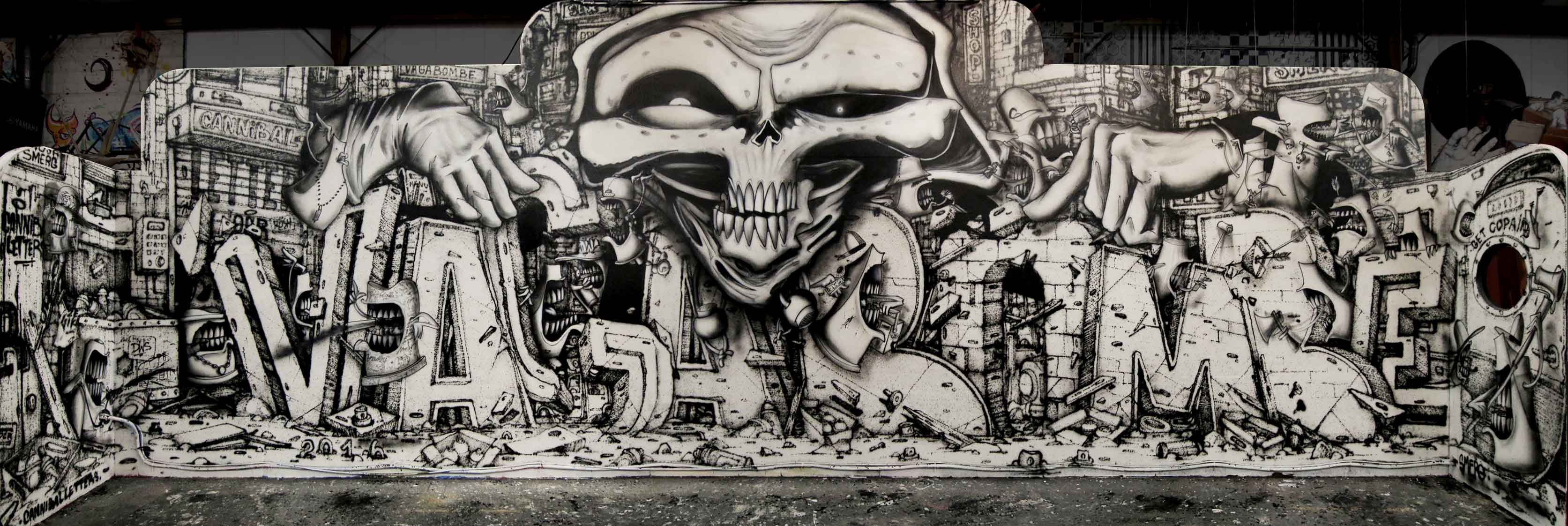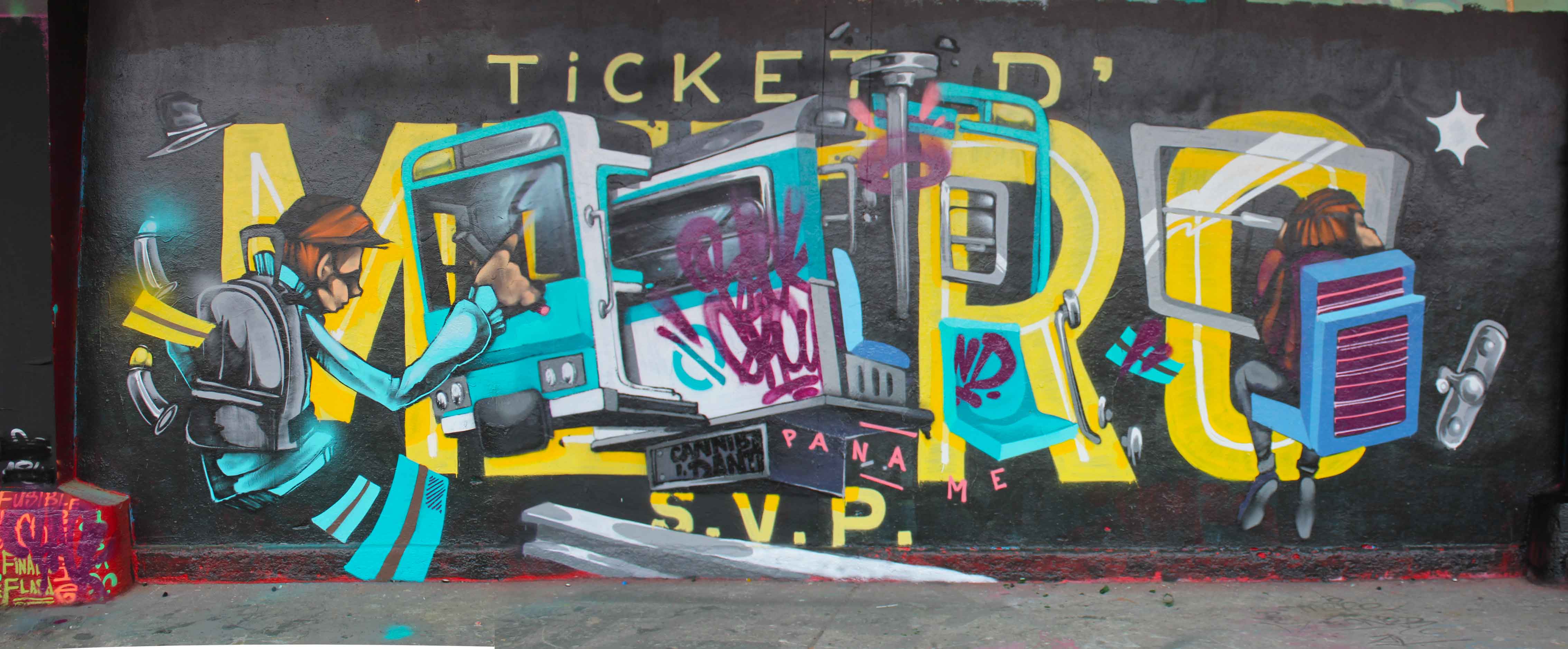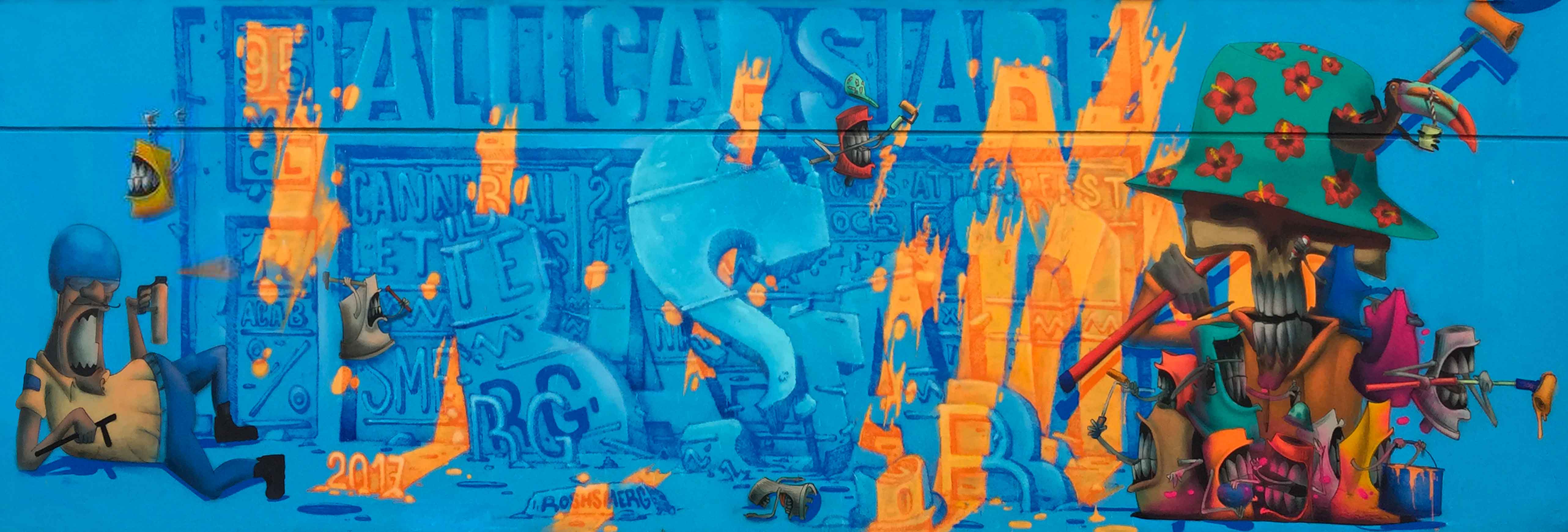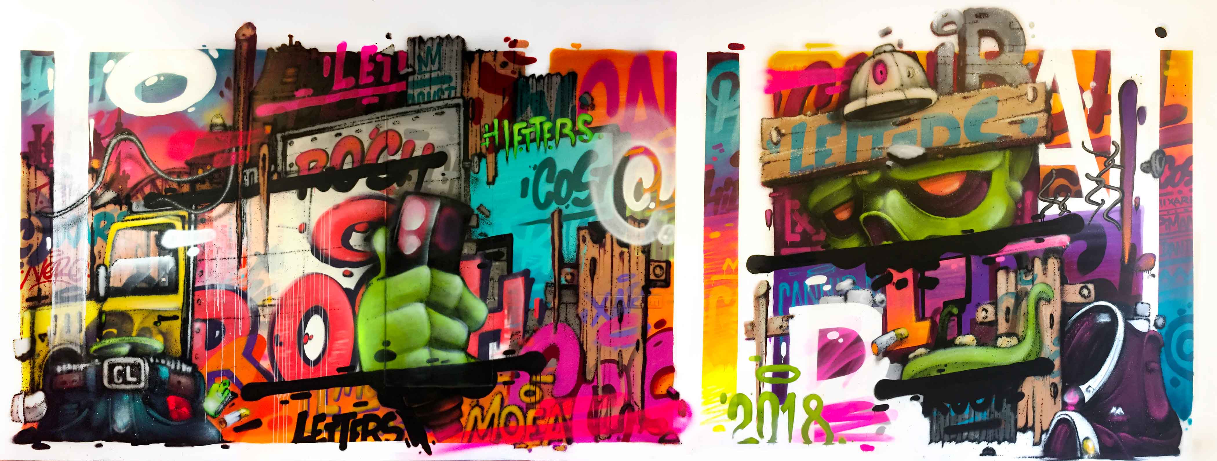 Au centre de son œuvre se trouve la typographie, sa passion, mais aussi un univers de bandes dessinées et d’illustrations dans lesquels il trouve une source d’inspiration inépuisable. Chez lui, les lettres se mangent à toutes les sauces et se consomment sans modération. Sur tous les supports possibles, du dessin à la toile, de la batte de baseball au casque de moto en passant bien évidement sur les murs.