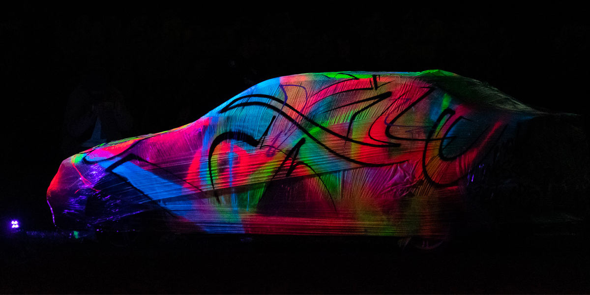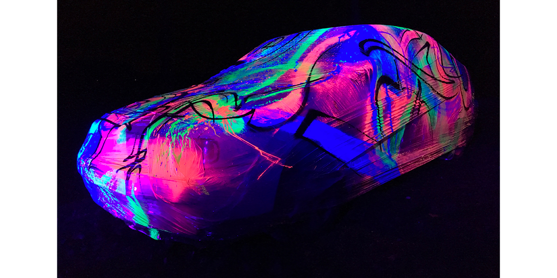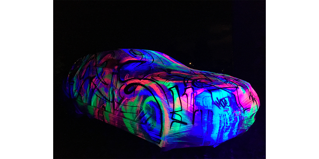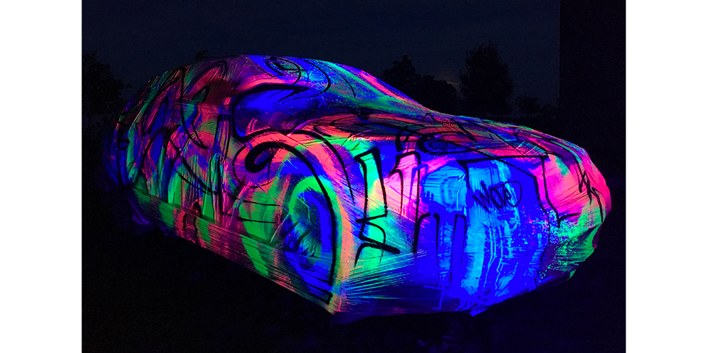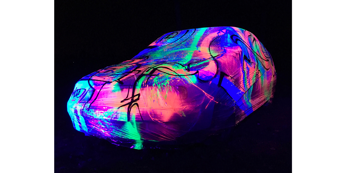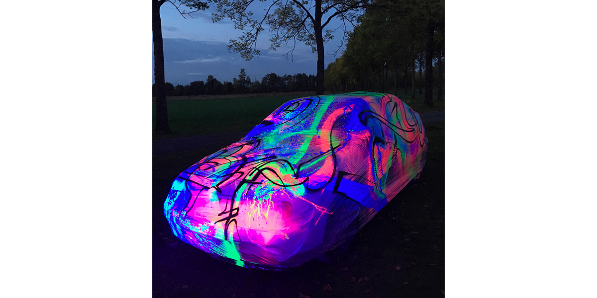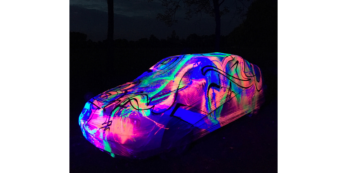 To play with the lighting effects and the dark night, the choice fell on the fluorescent paint revealed by UV light for a brilliant result.