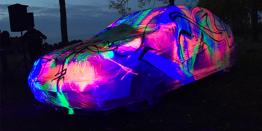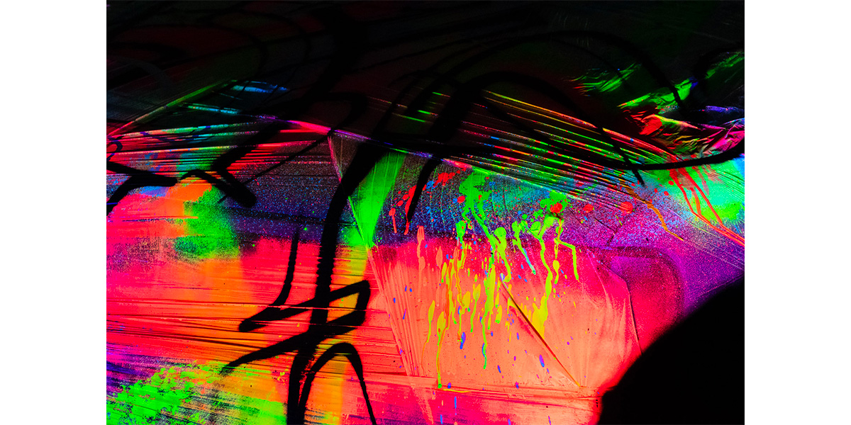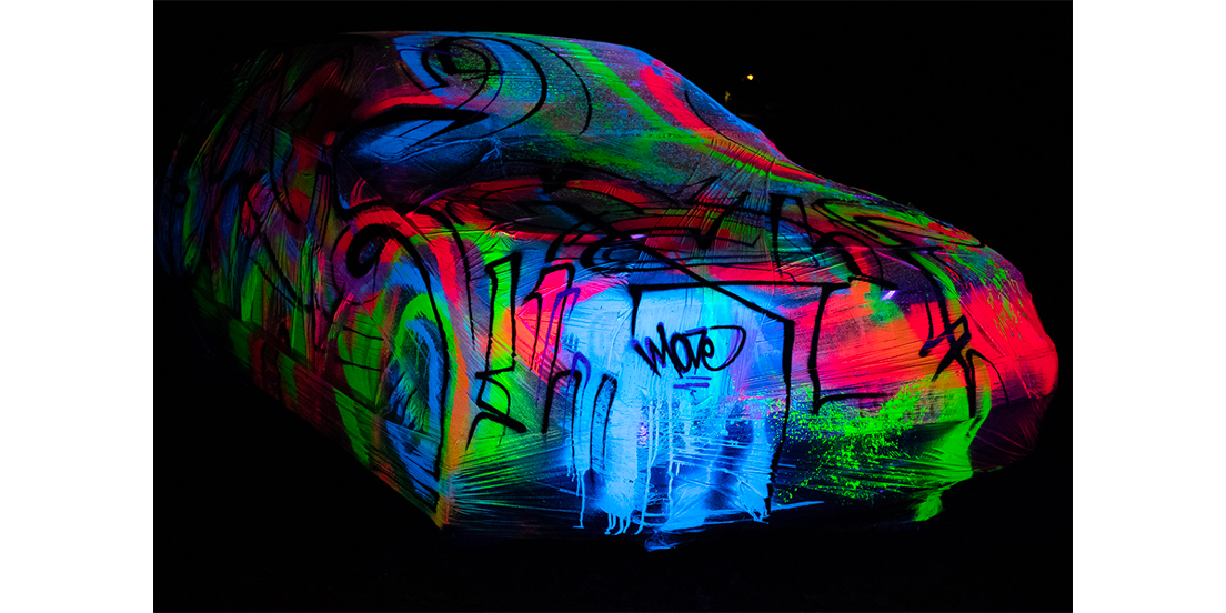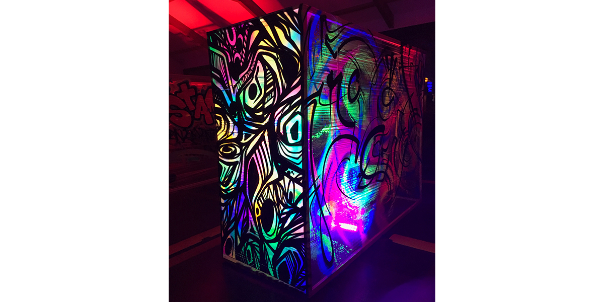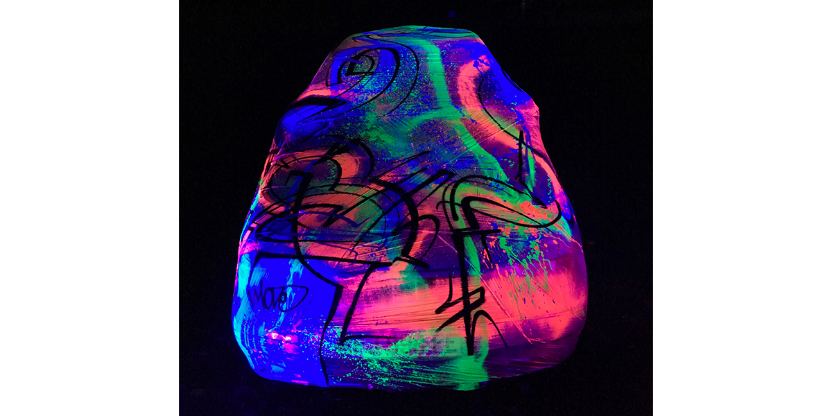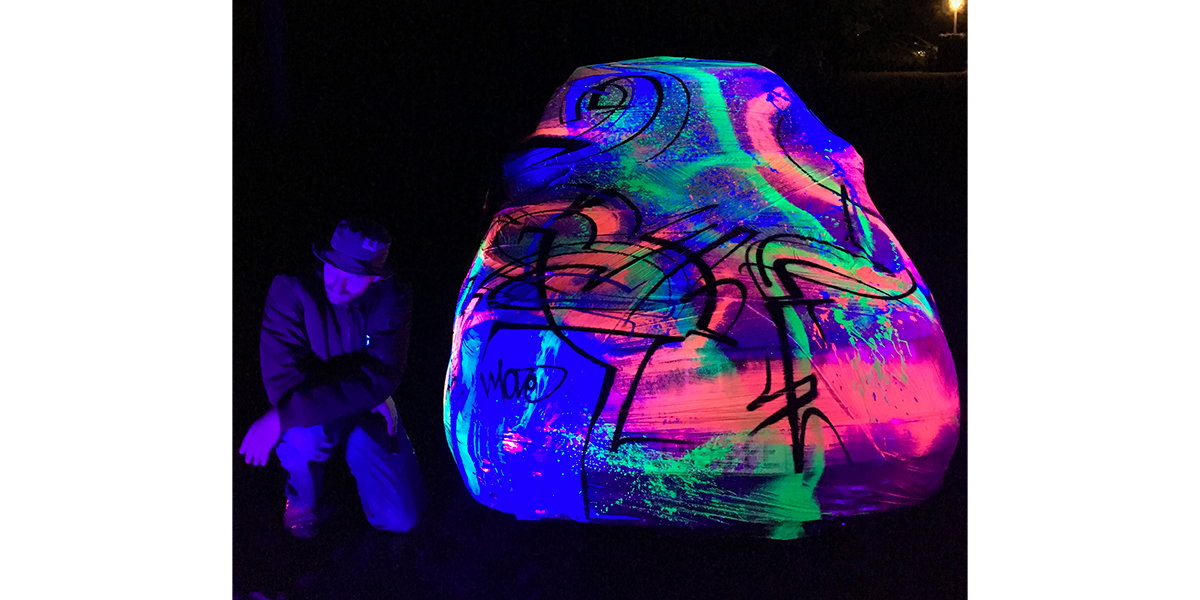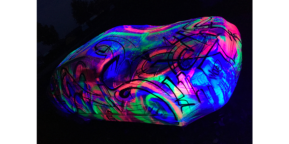To play with the lighting effects and the dark night, the choice fell on the fluorescent paint revealed by UV light for a brilliant result.