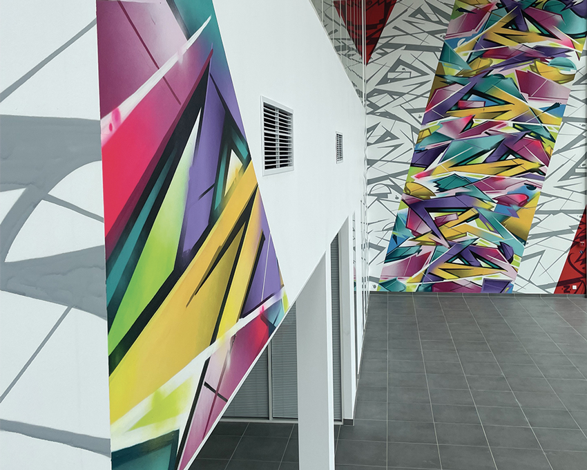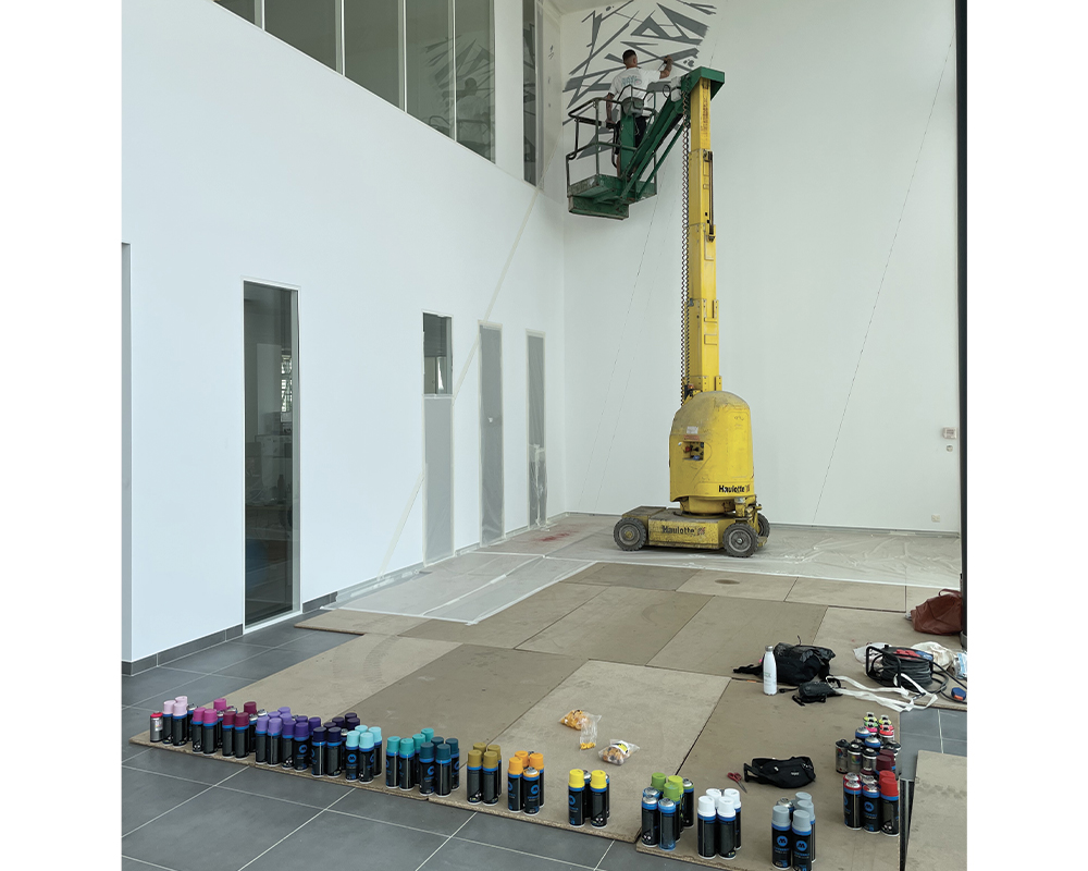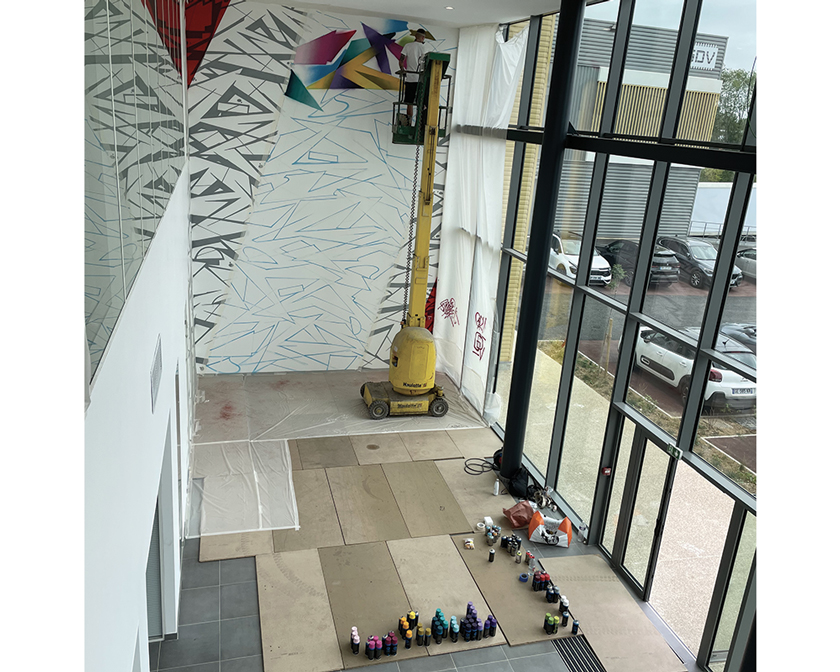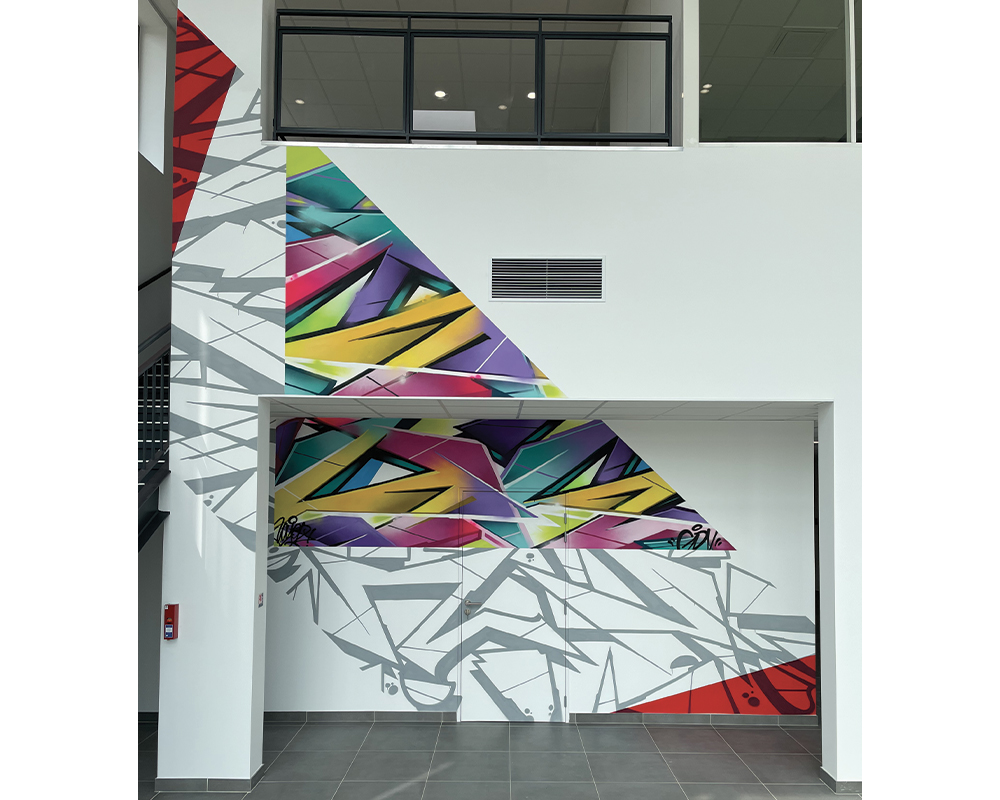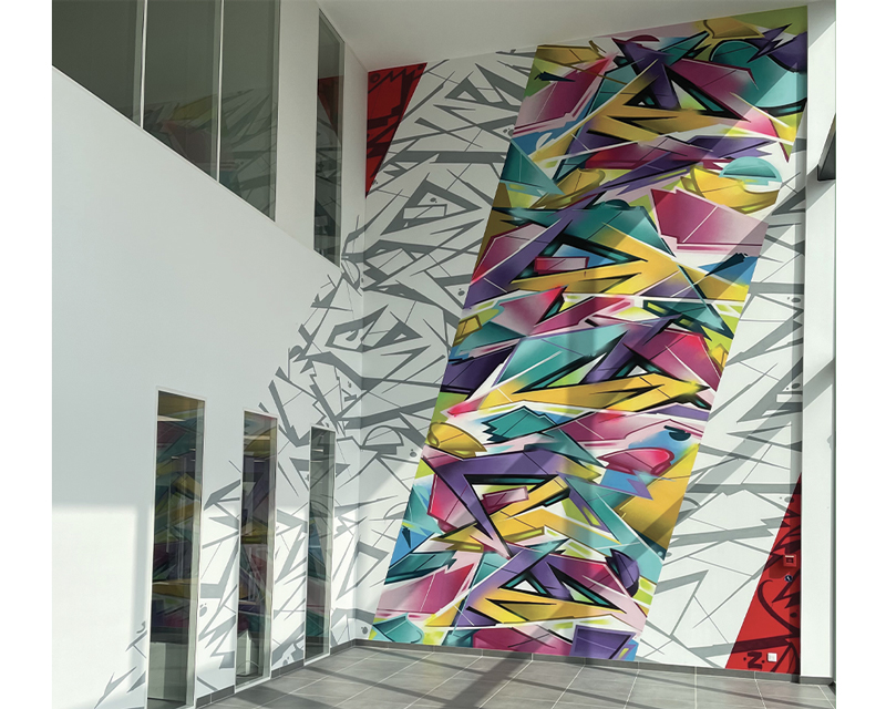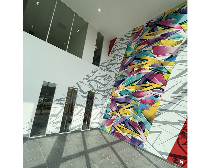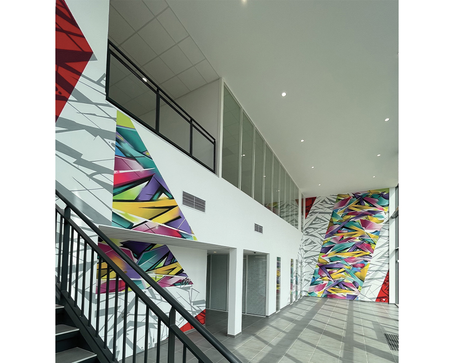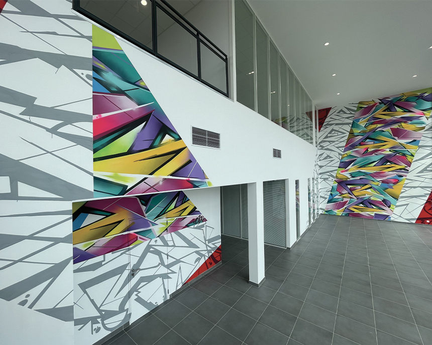 Un chantier XXL axé sur un travail abstrait, géométrique, coloré et dynamique pour une identité affirmée dans l'espace d'accueil.