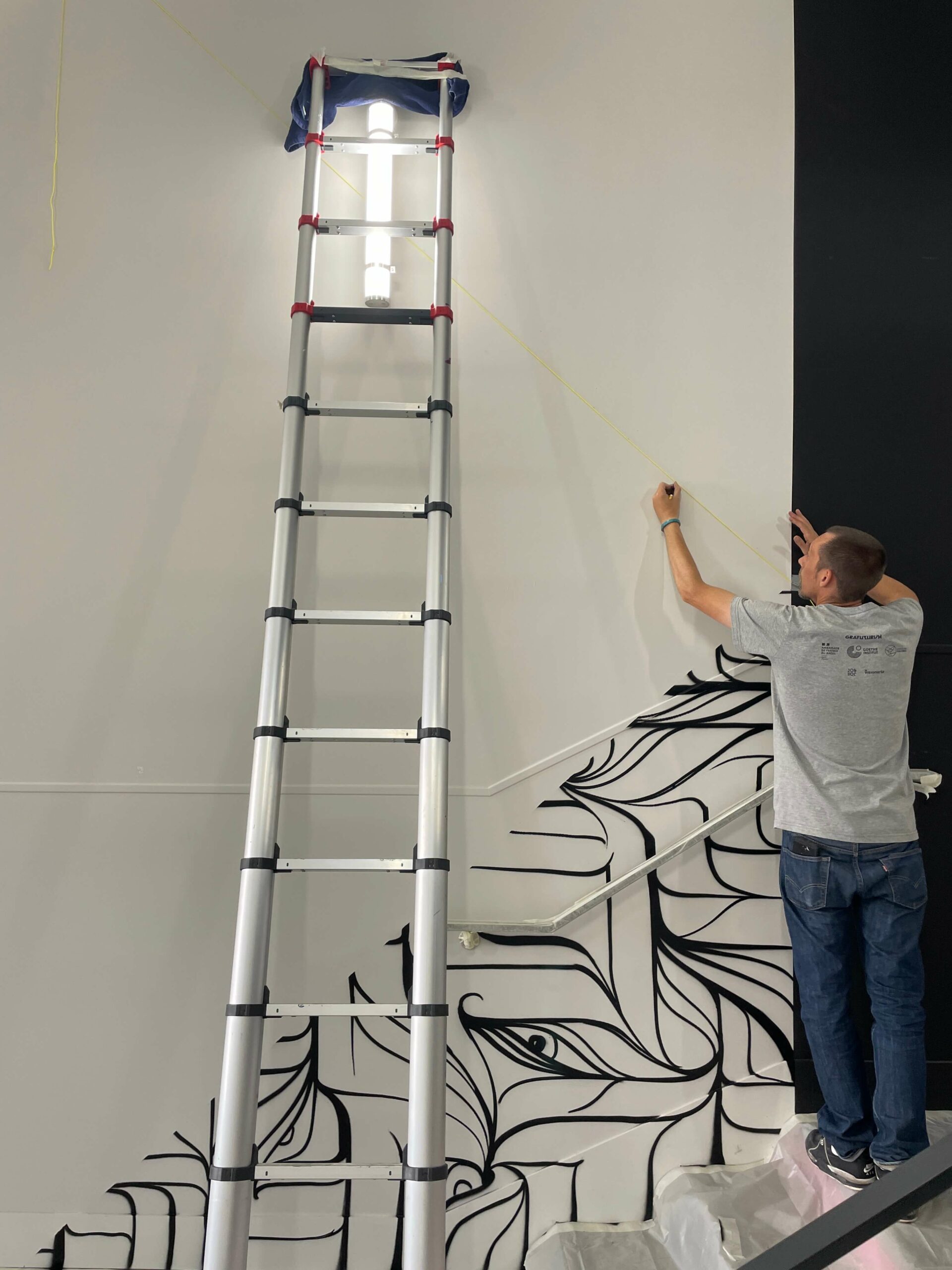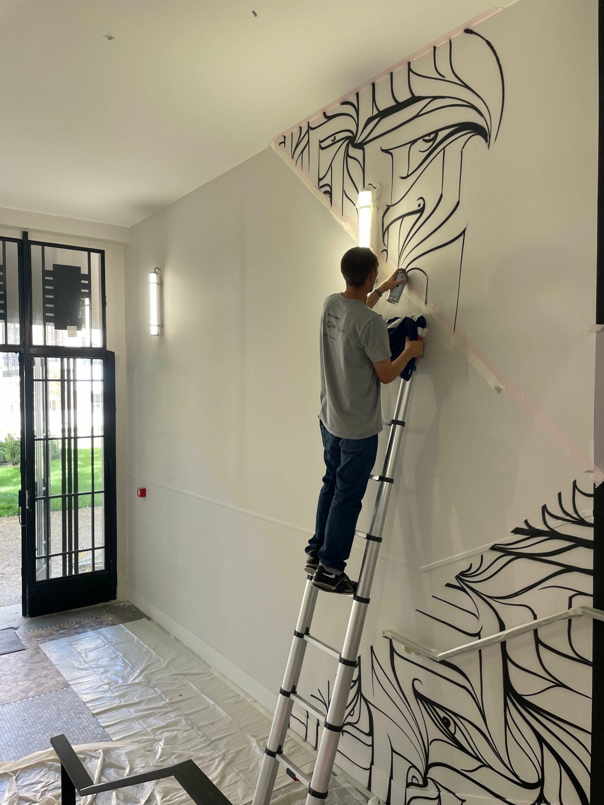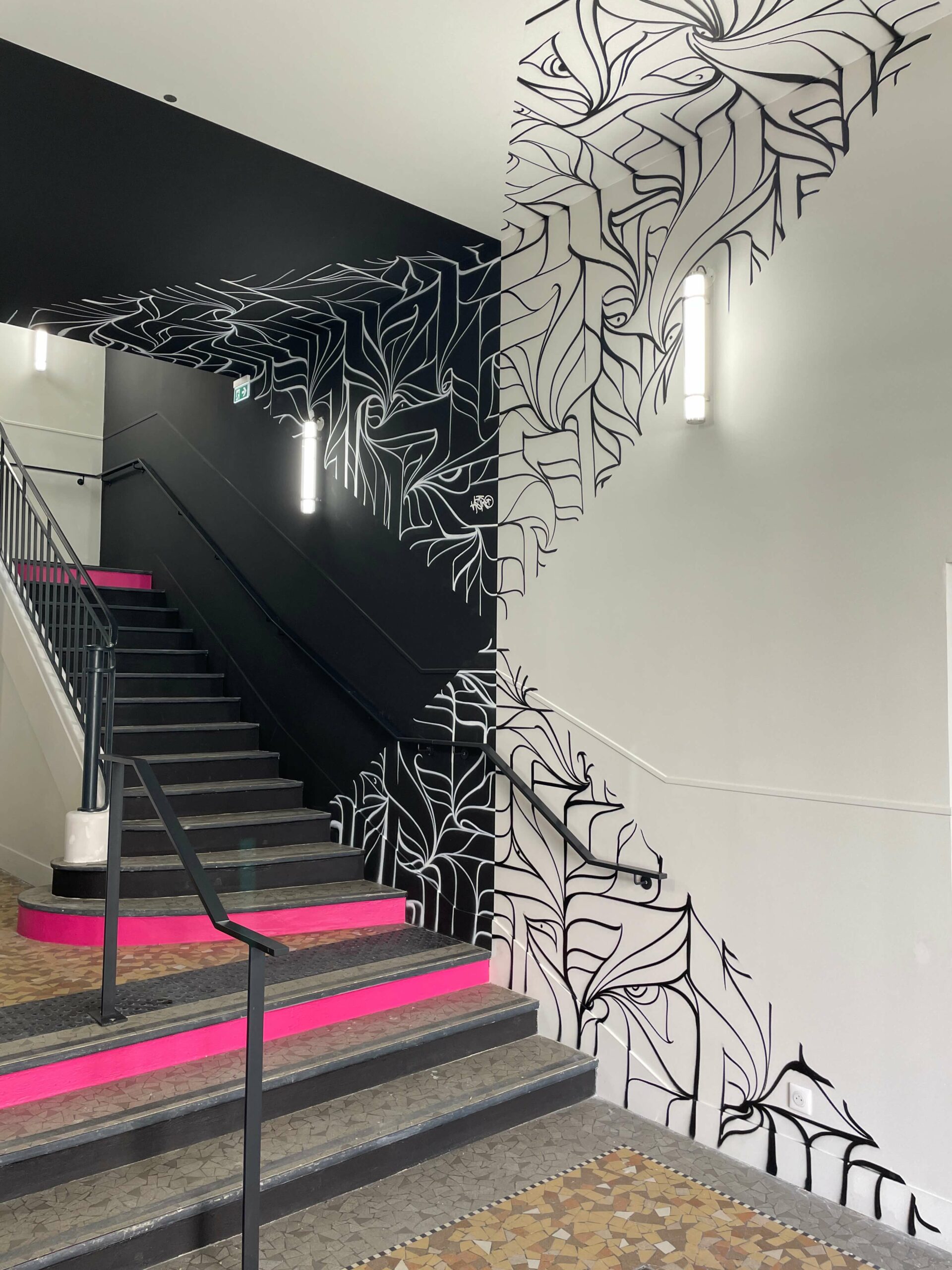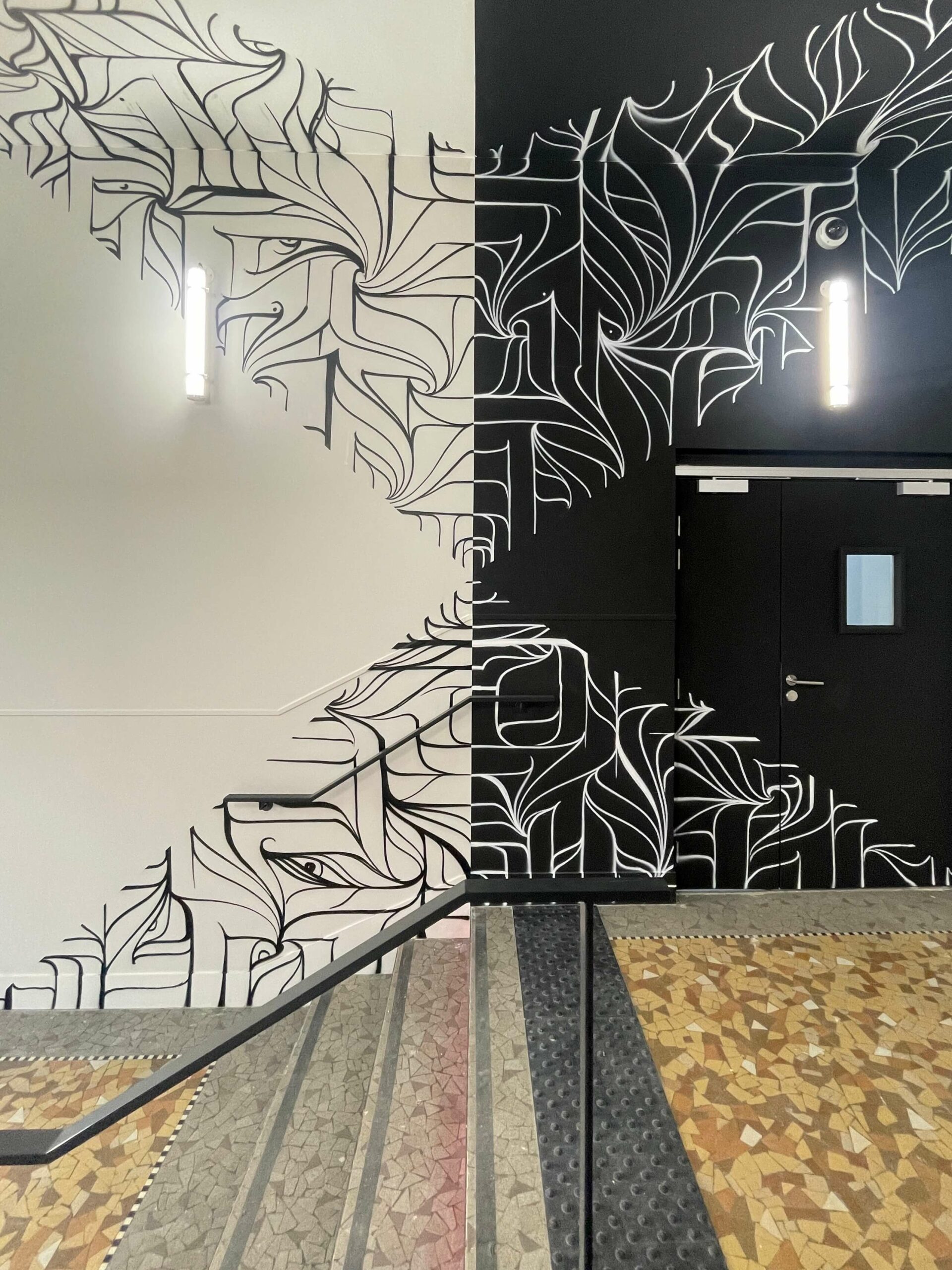 Pensée selon un cahier des charges précis : composition aérée, en noir et blanc, dialoguant avec les espaces… Cette œuvre immersive affiche une identité forte dès l’entrée en proposant une expérience artistique mémorable pour les étudiants et visiteurs. Une image de marque valorisée dans un lieu différenciant.