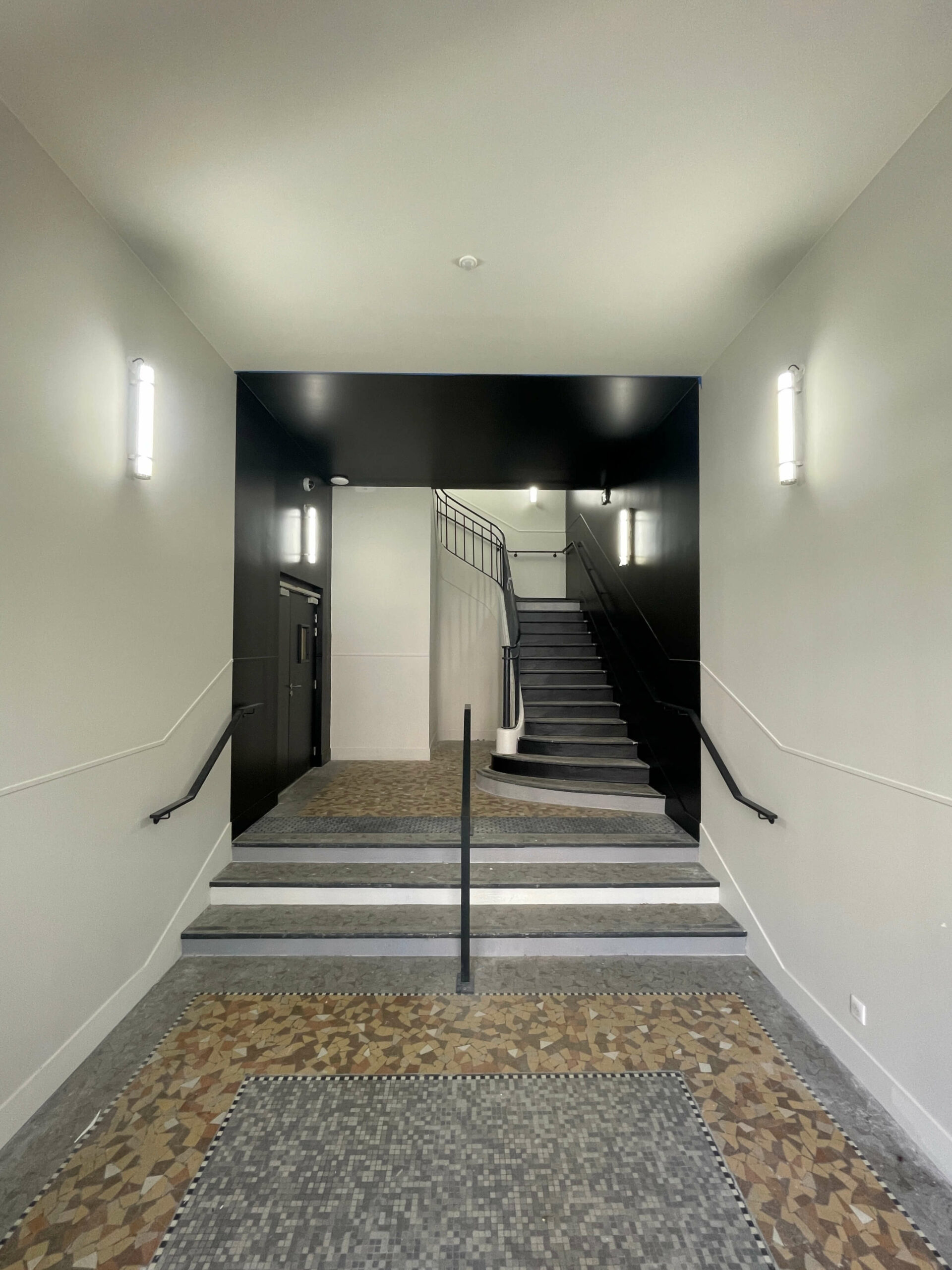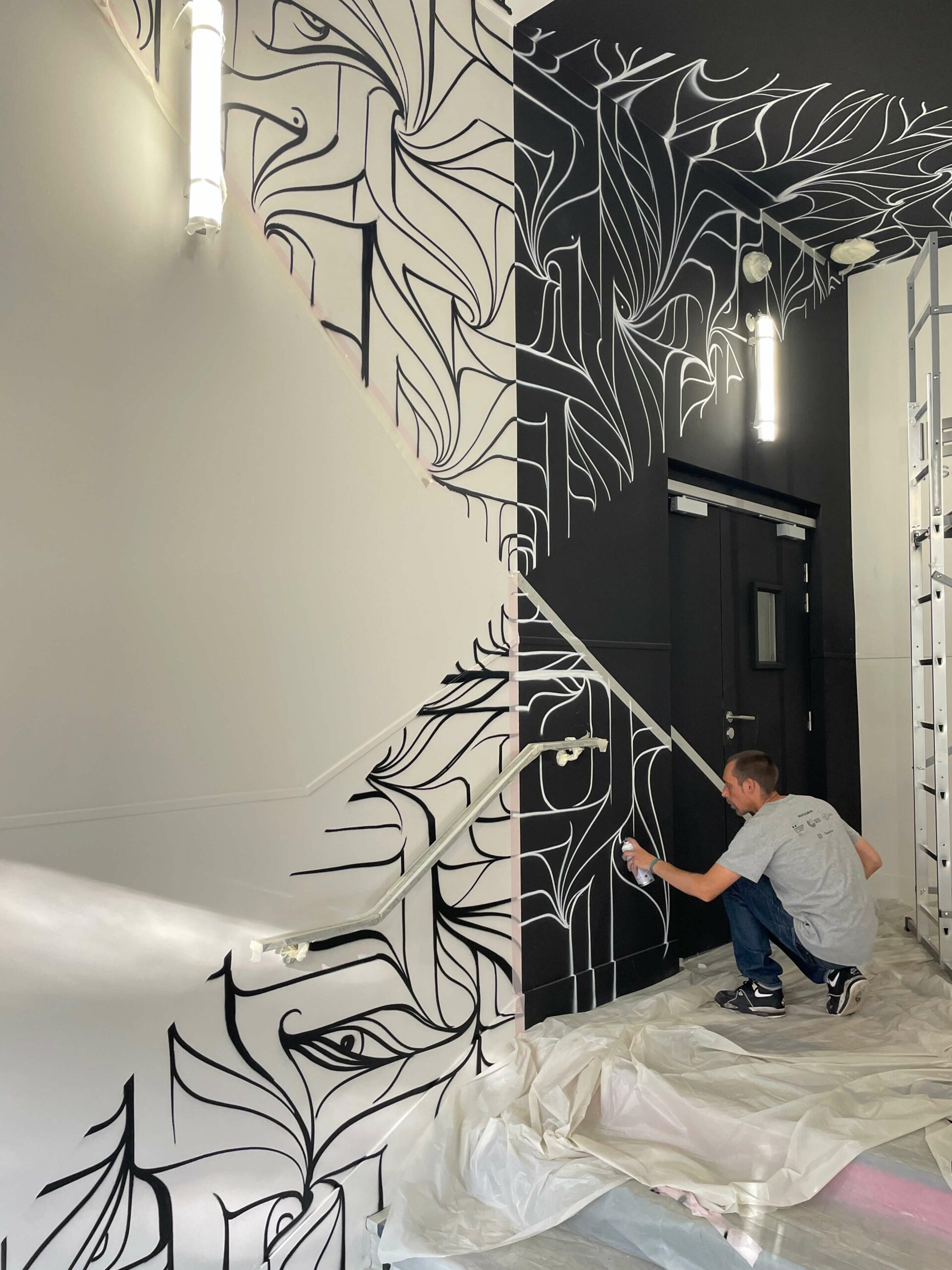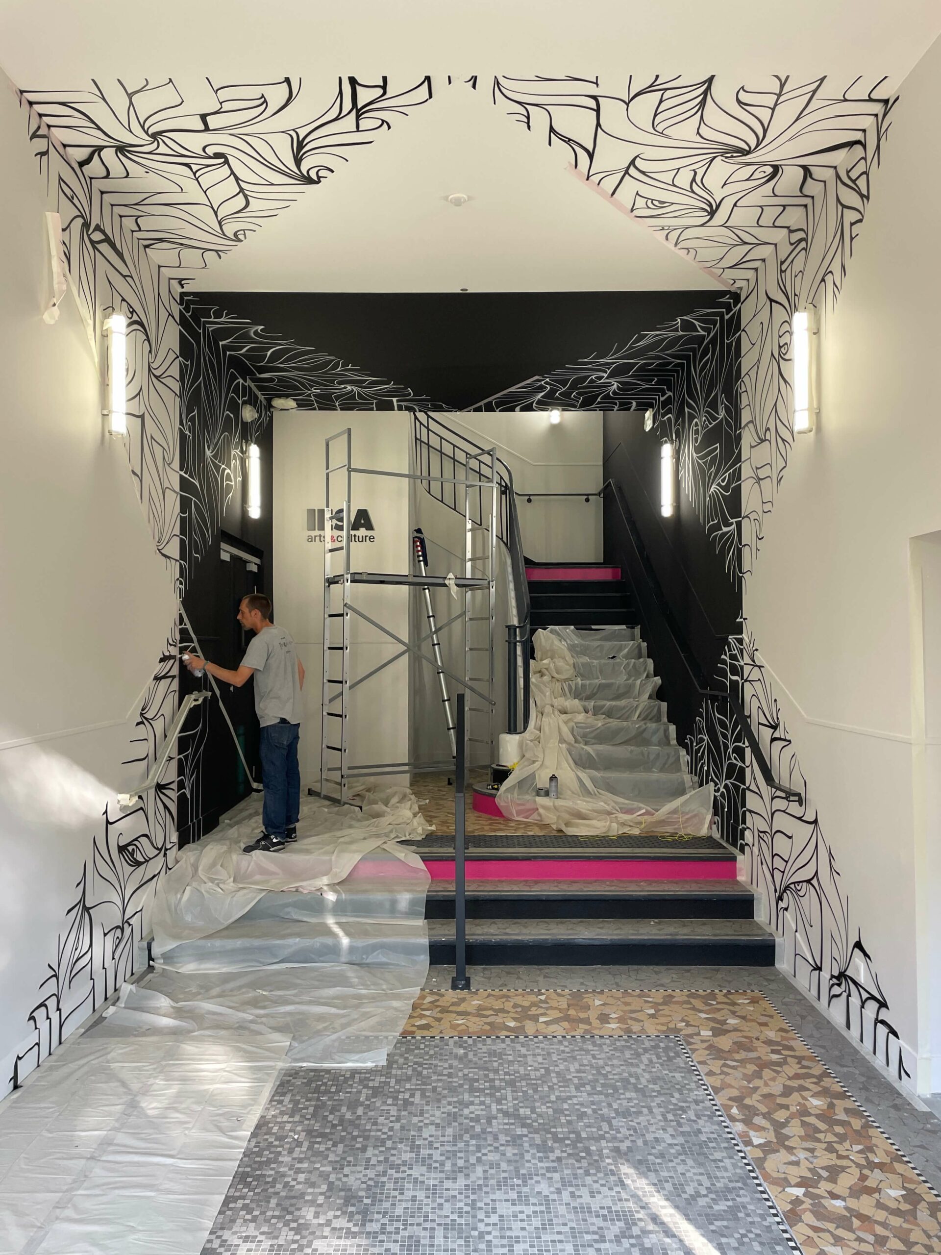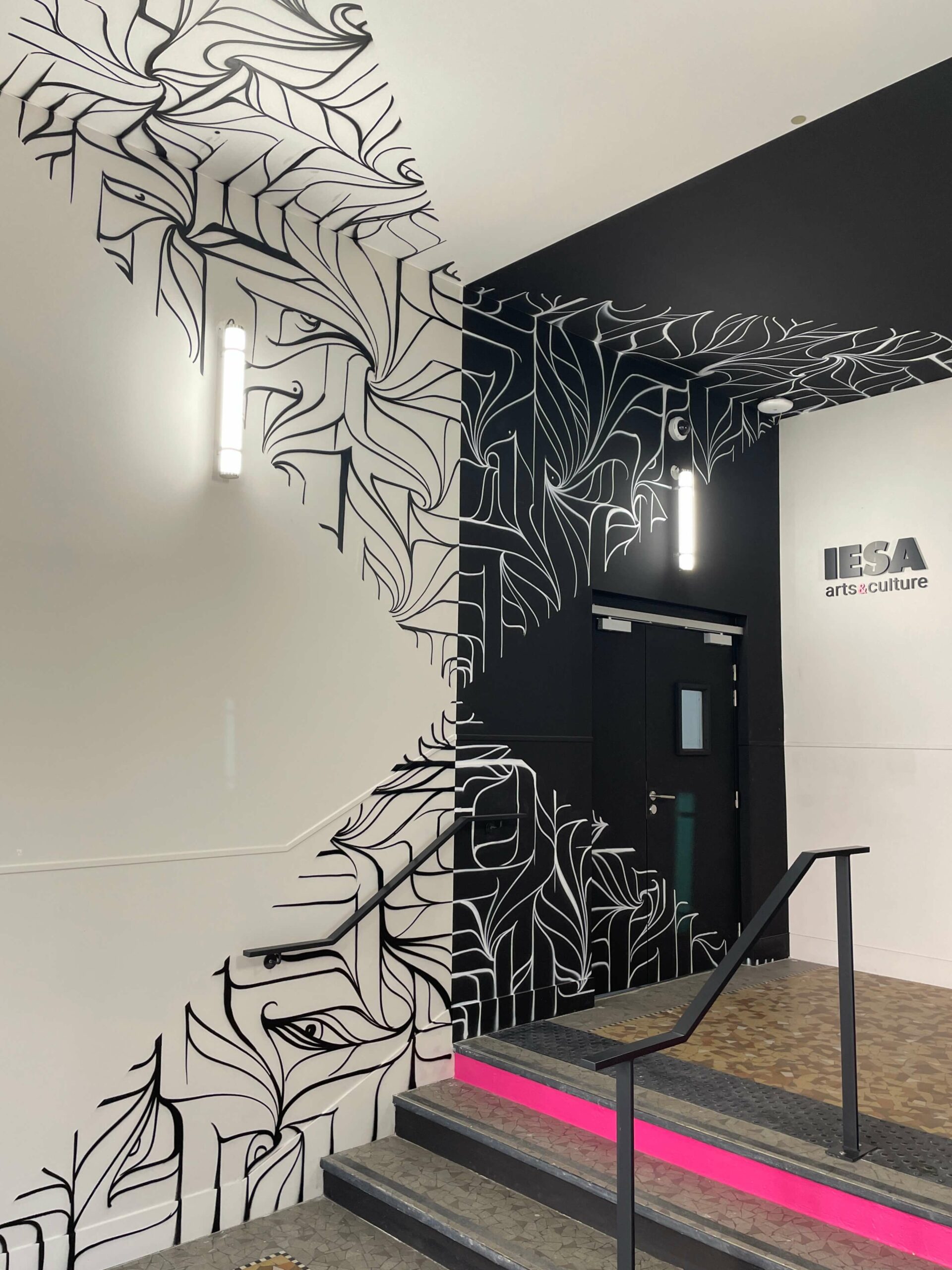 Pensée selon un cahier des charges précis : composition aérée, en noir et blanc, dialoguant avec les espaces… Cette œuvre immersive affiche une identité forte dès l’entrée en proposant une expérience artistique mémorable pour les étudiants et visiteurs. Une image de marque valorisée dans un lieu différenciant.
