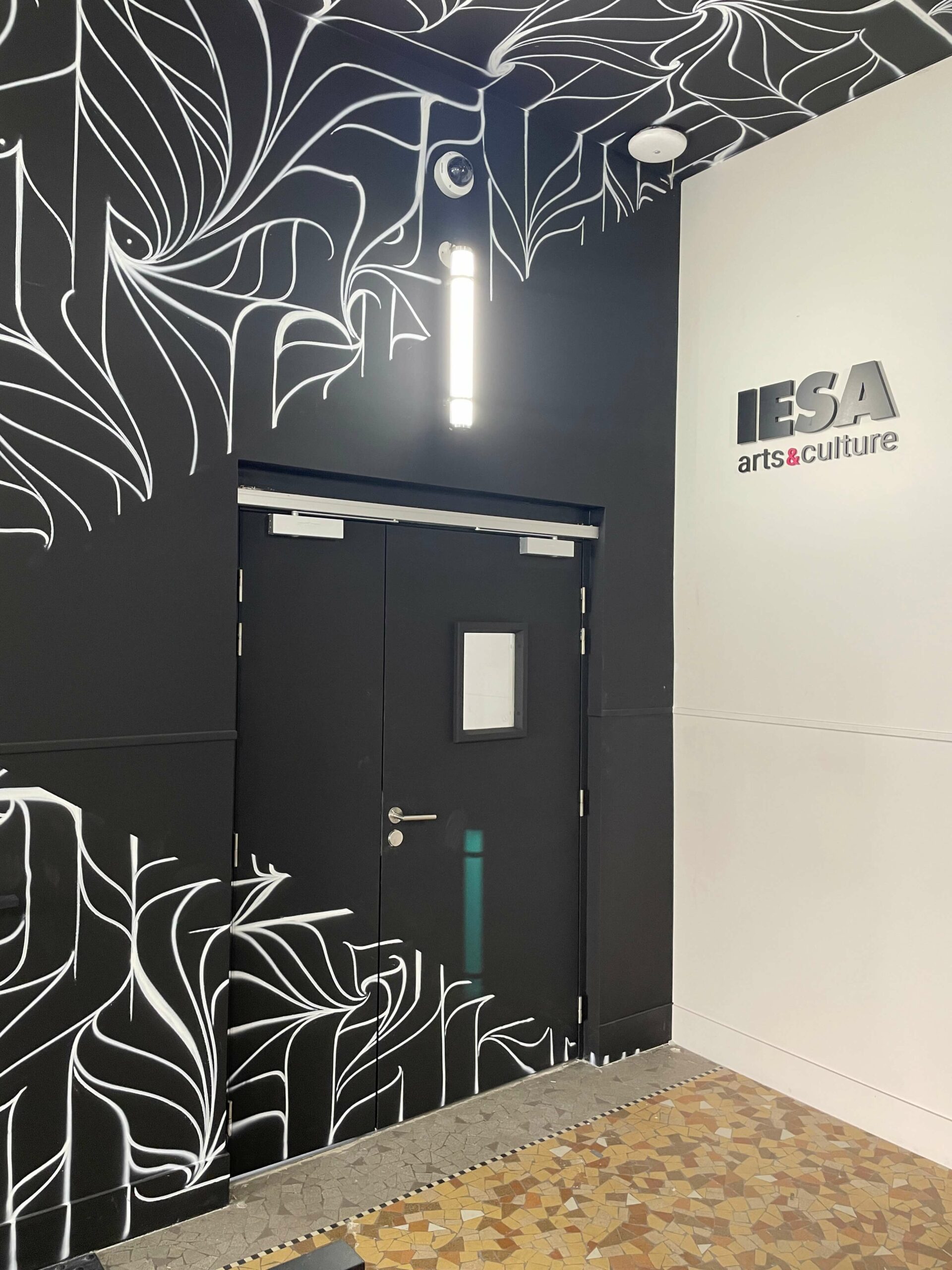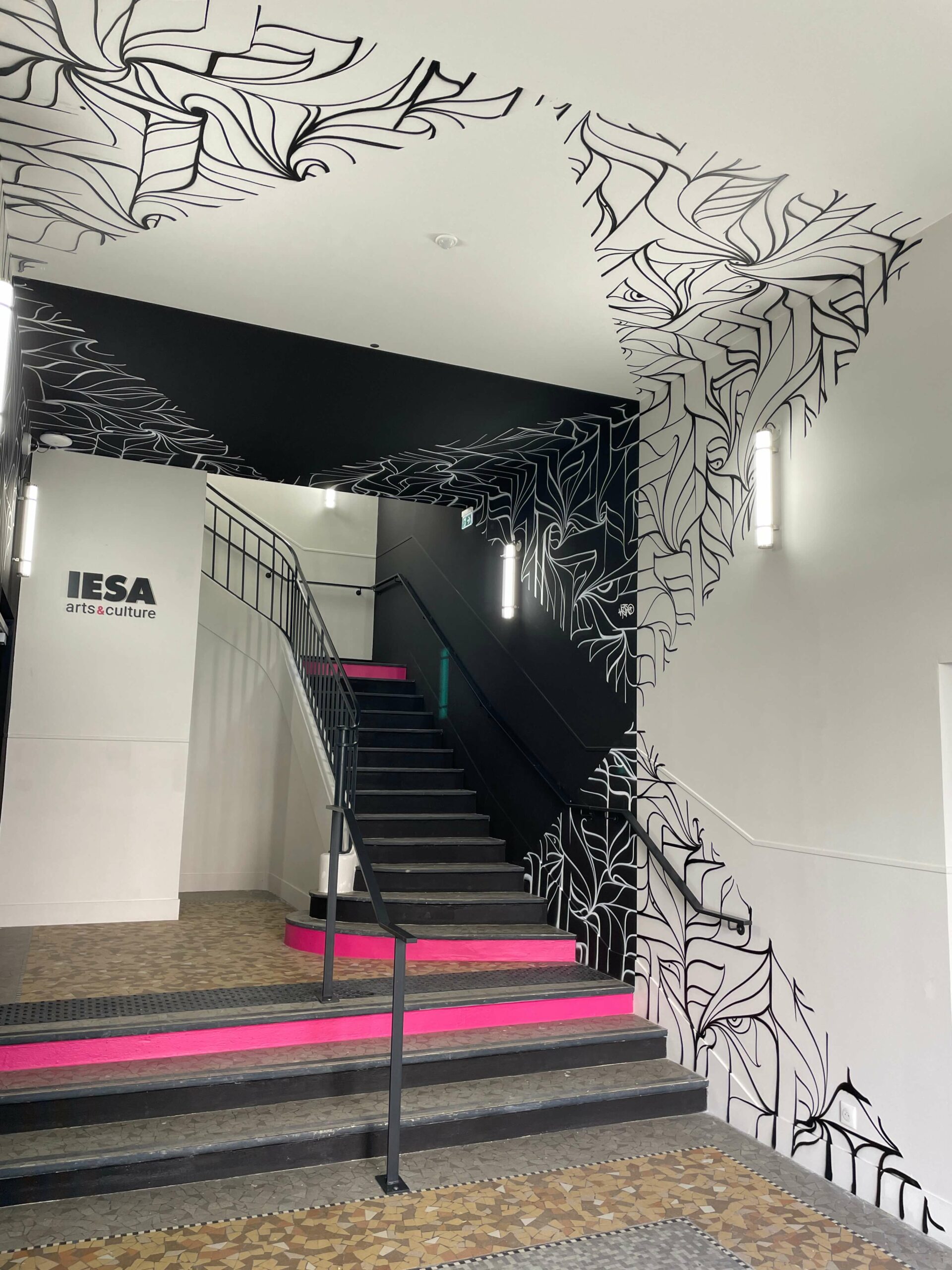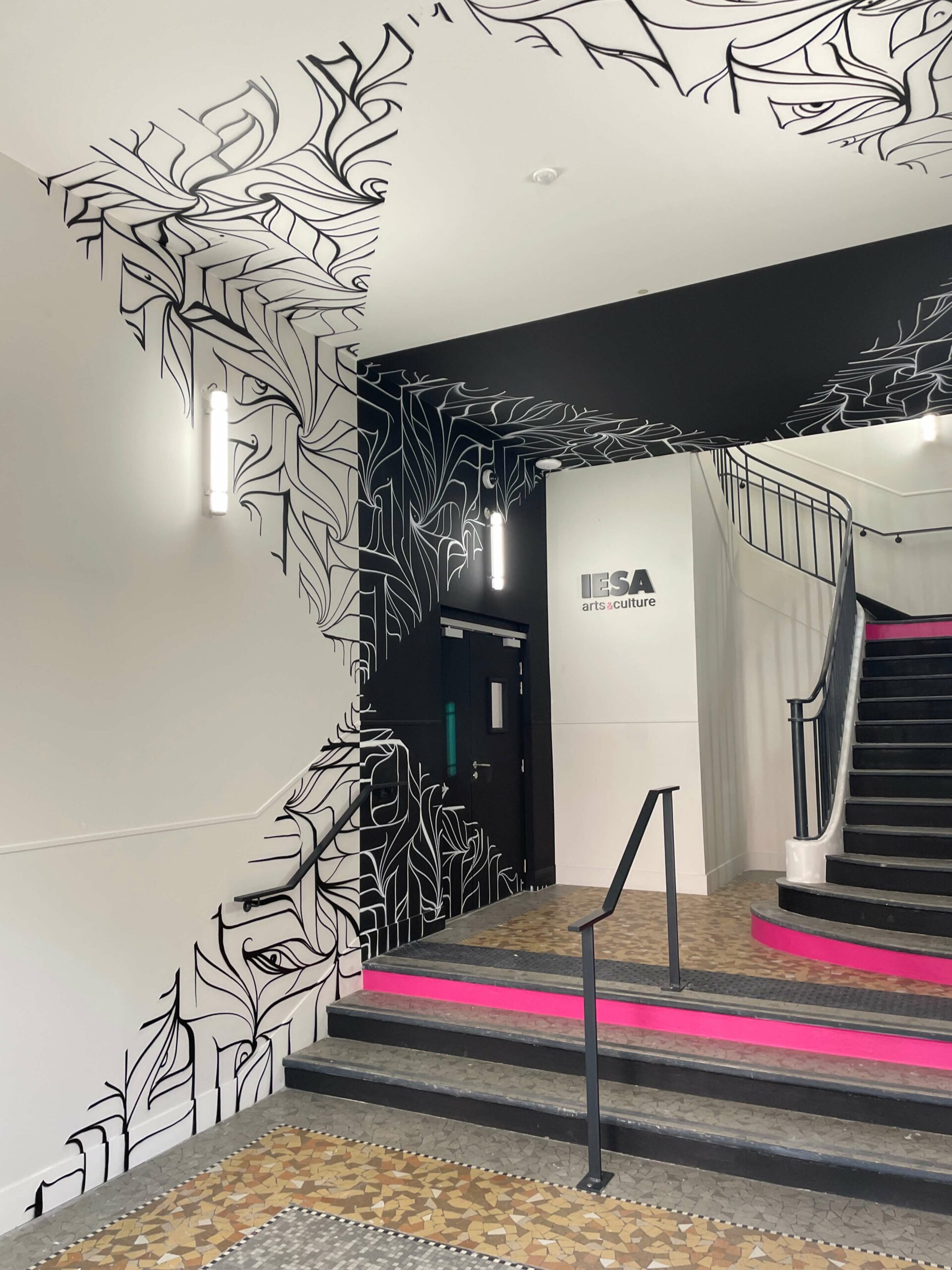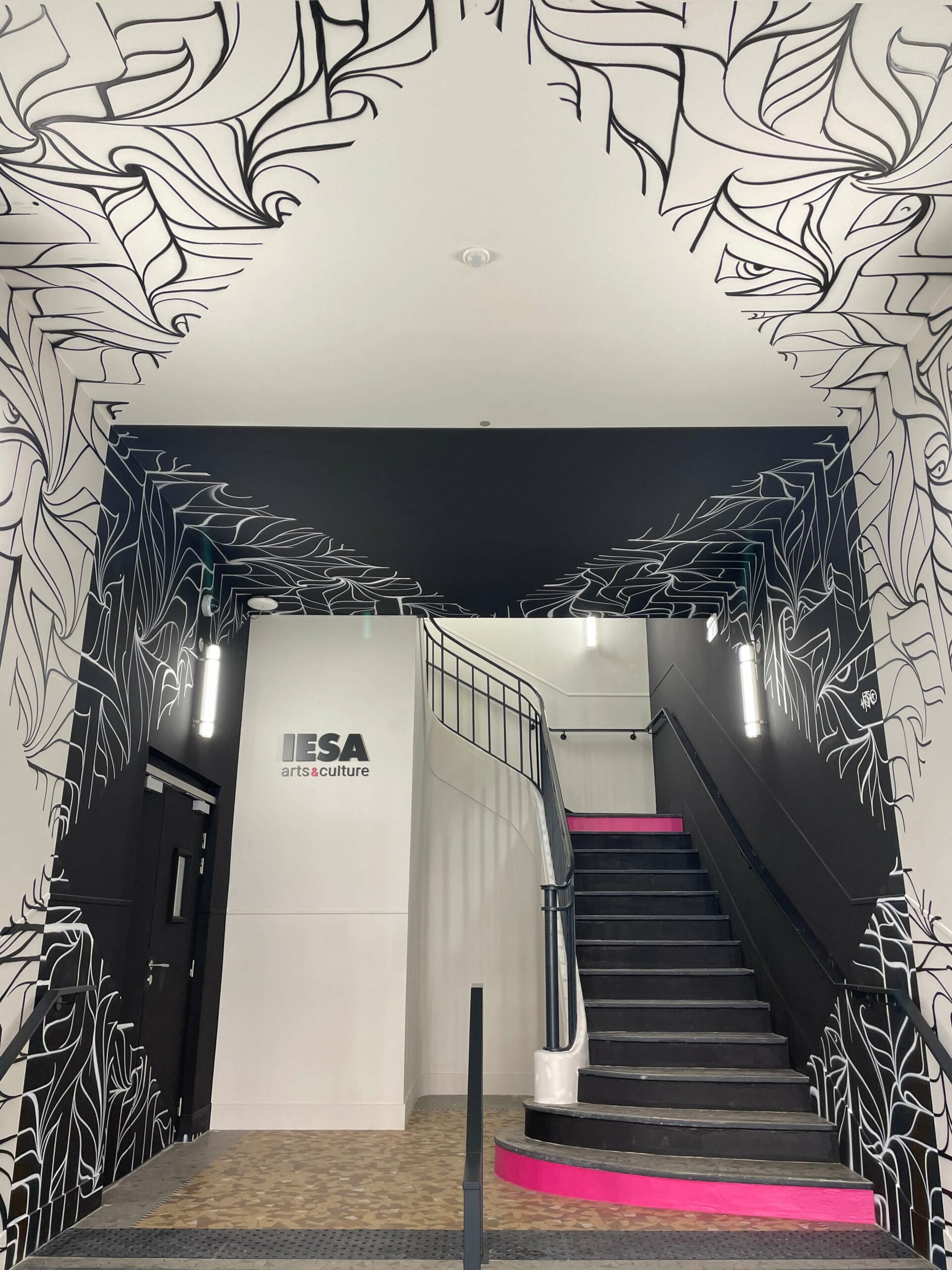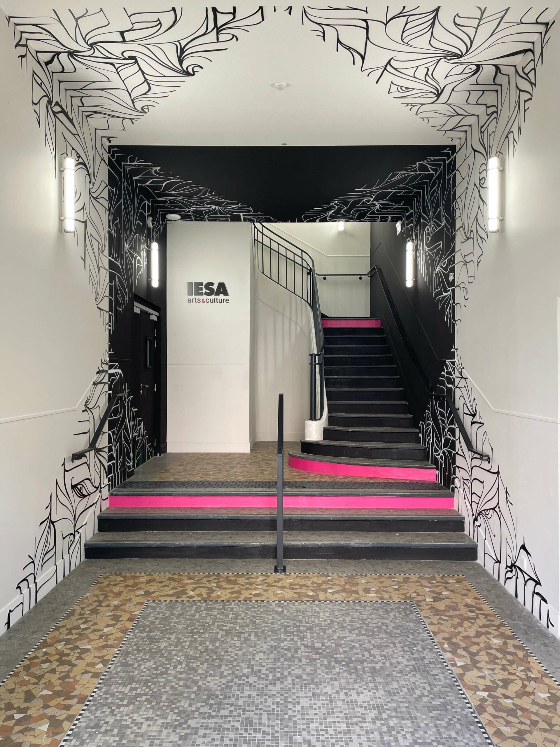 Pour l’inauguration de son nouvel établissement dans le 5ᵉ arrondissement de Paris, l’IESA nous a confié la transformation de son hall d’accueil avec la réalisation d’une fresque murale.