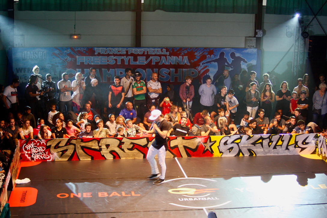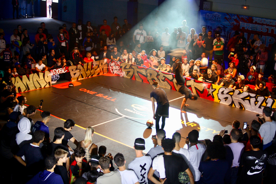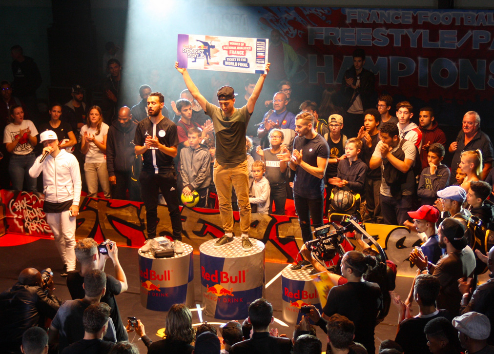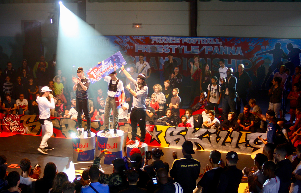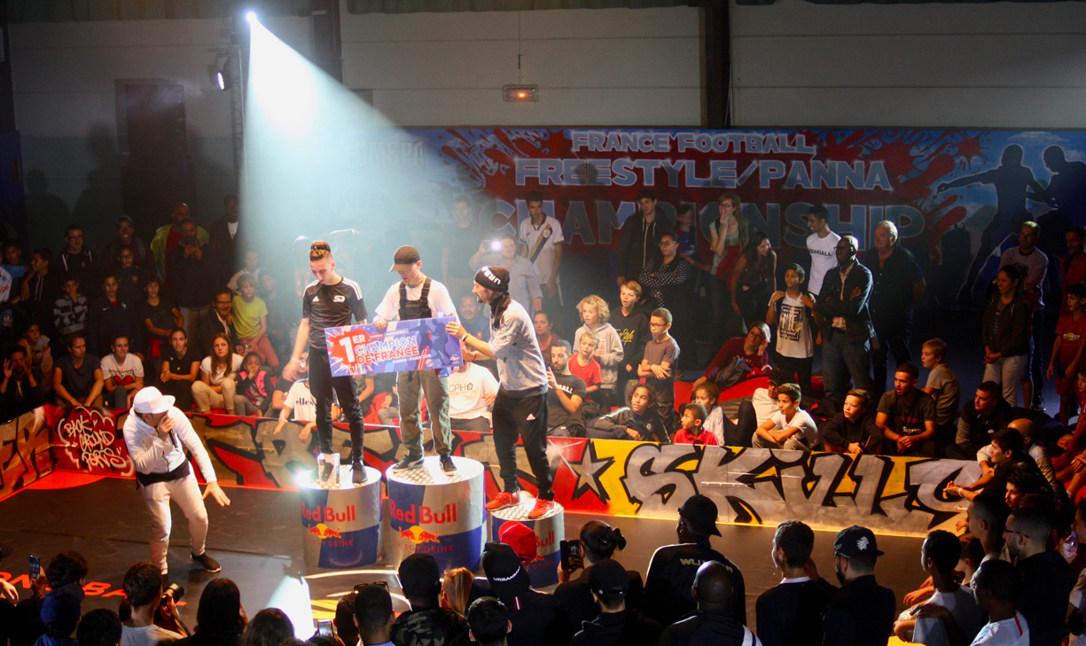 Habillage du terrain pour le championnat de France de football freestyle organisé par Red Bull.