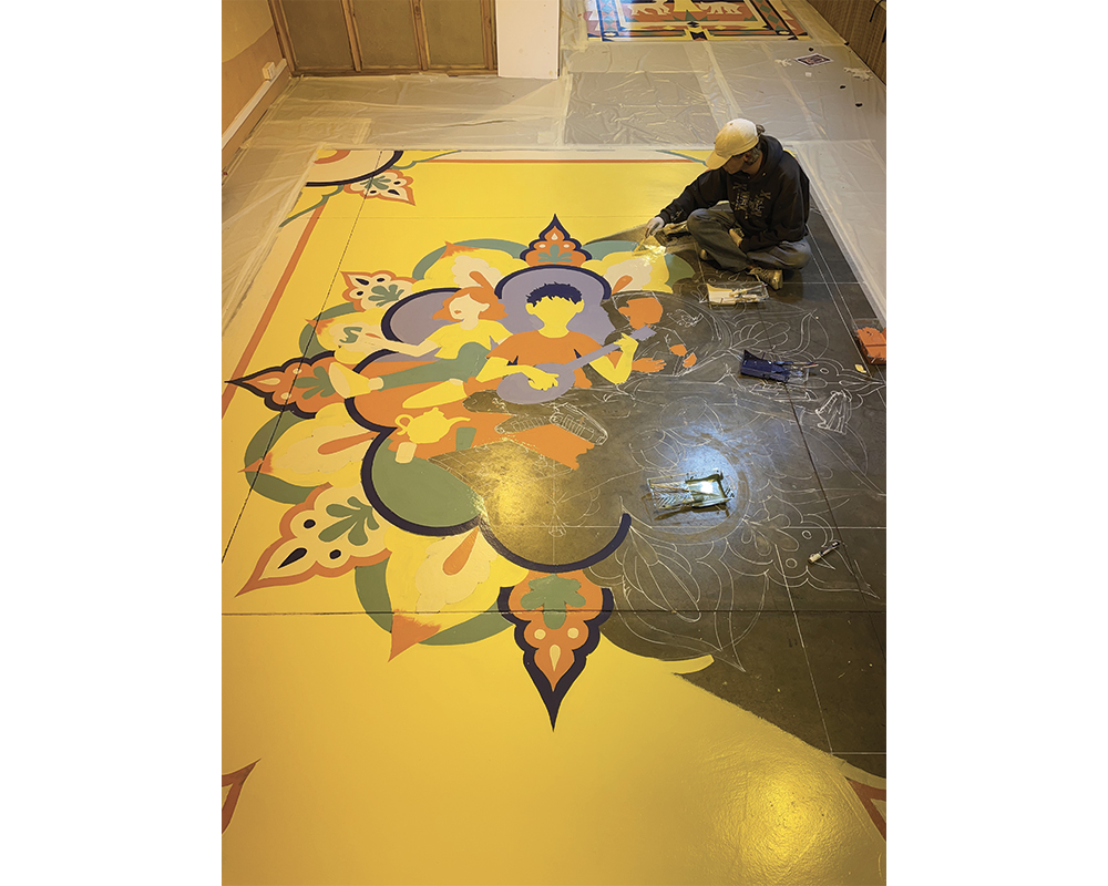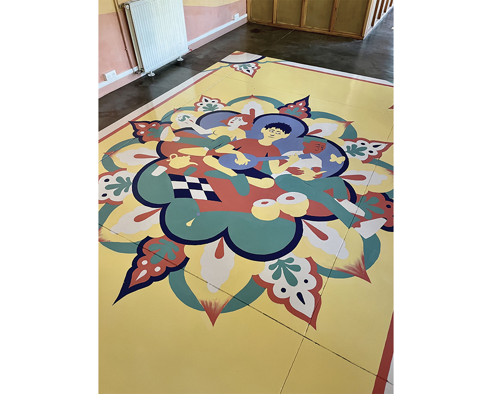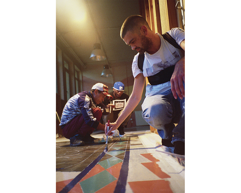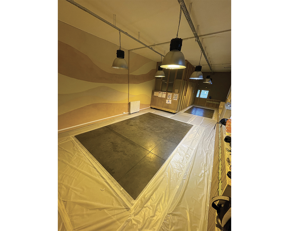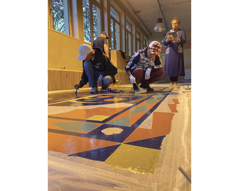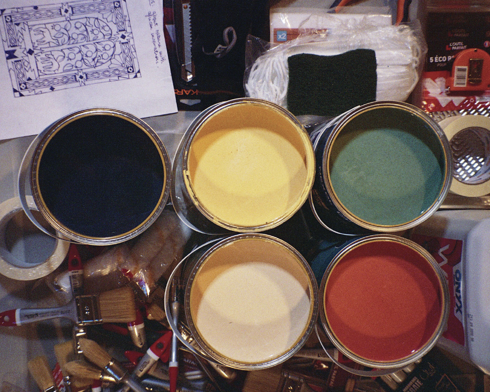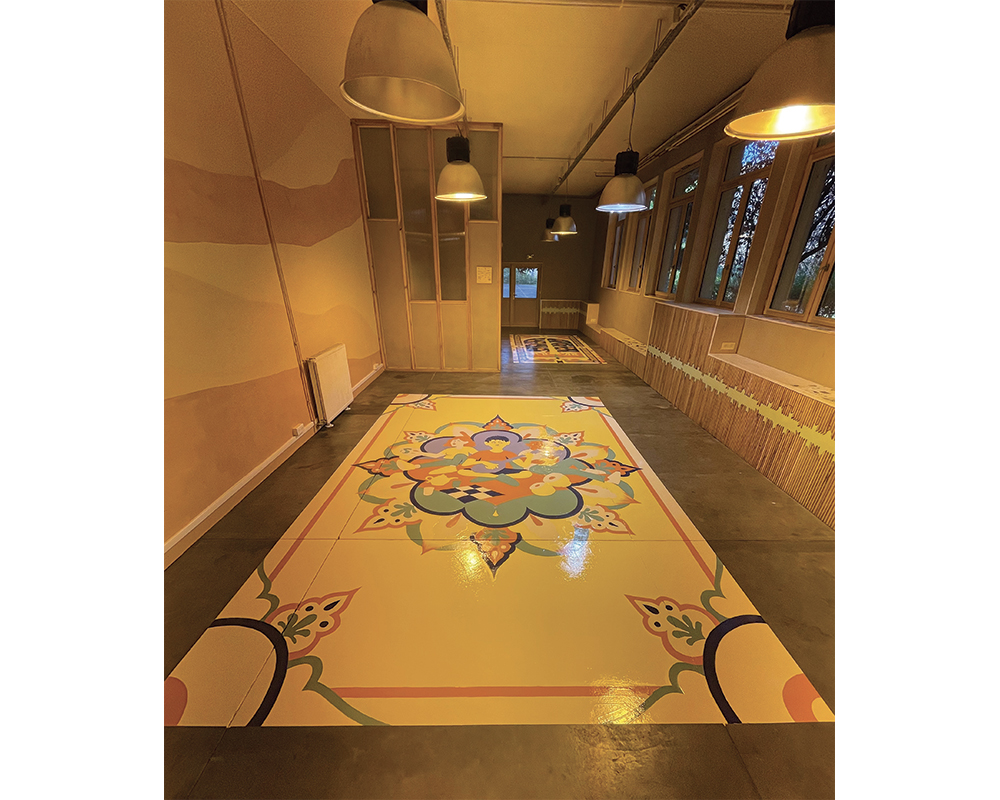 Habillage d'espaces sur le sol de la salle de repos du Secours Catholique du 19eme arrondissement de Paris.