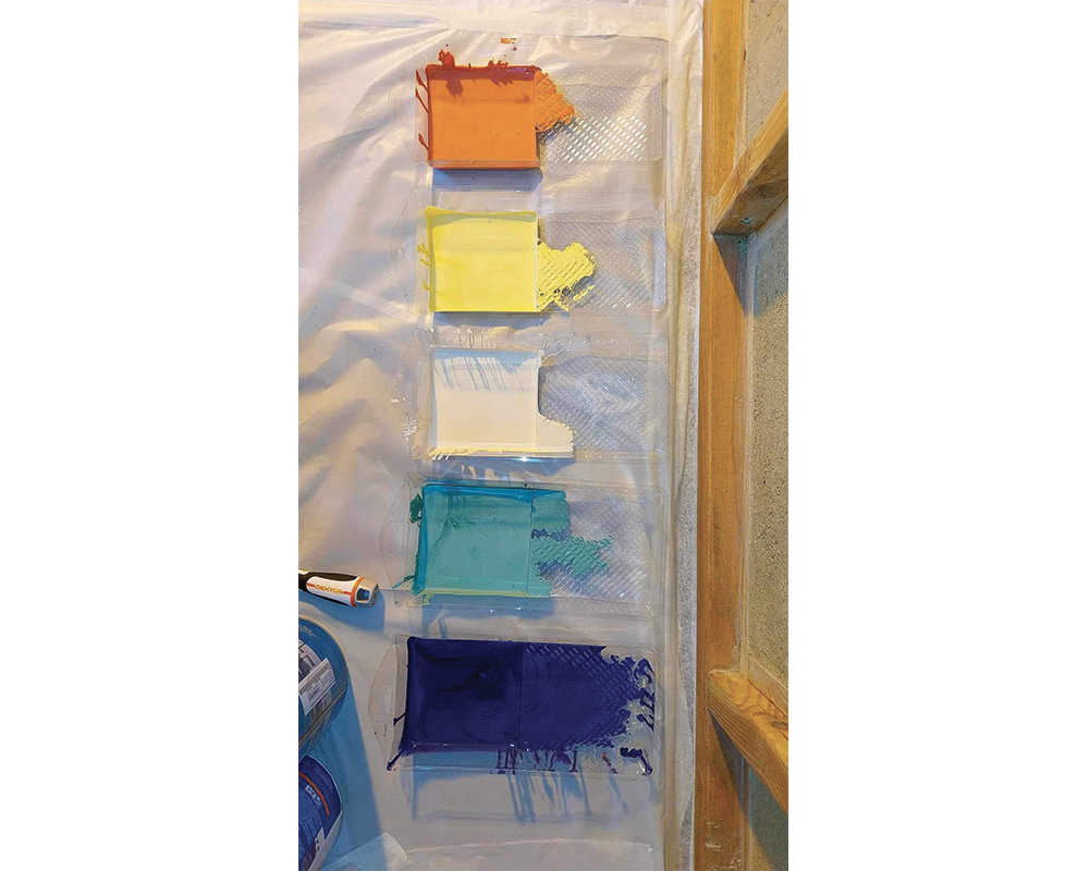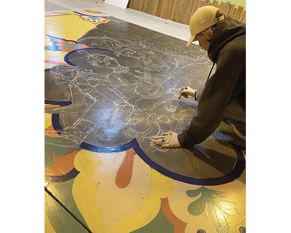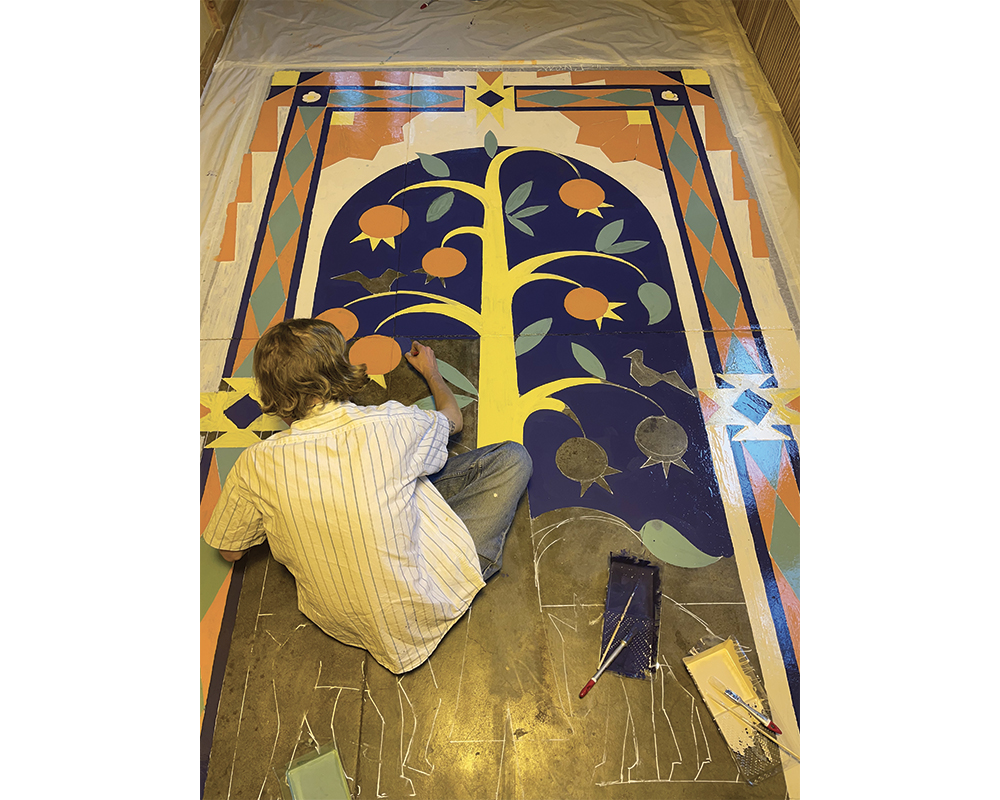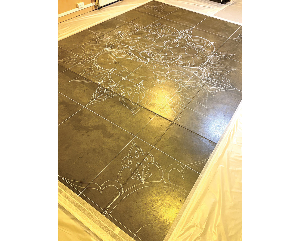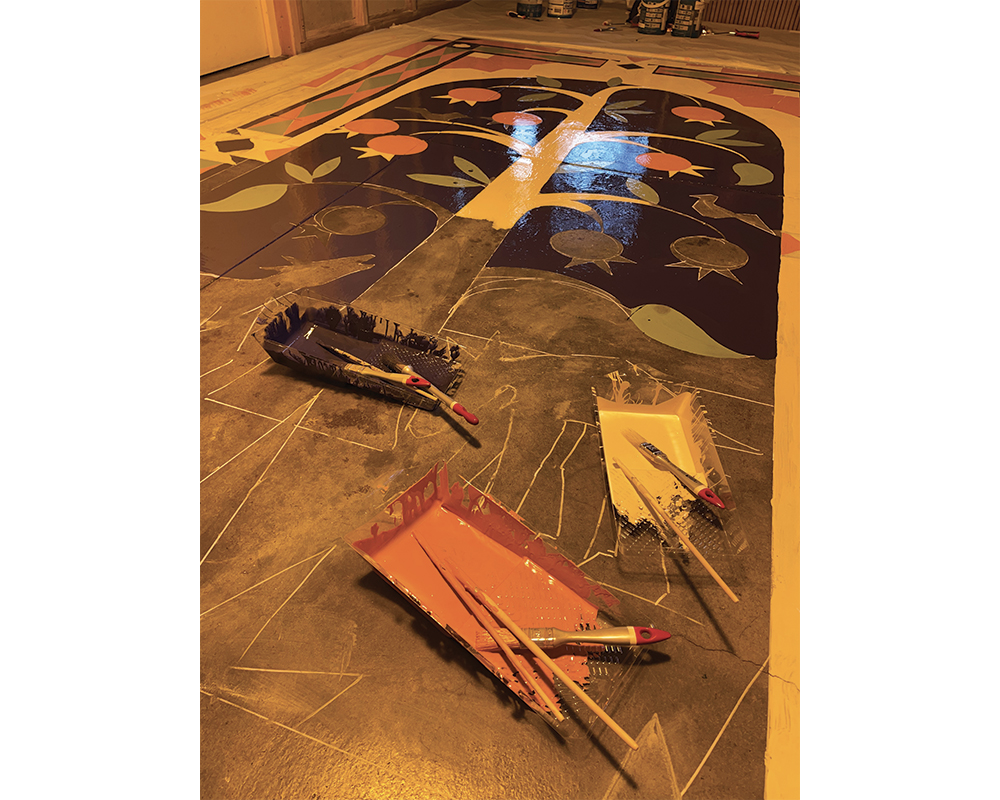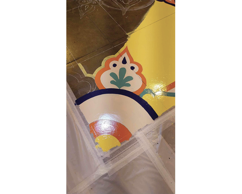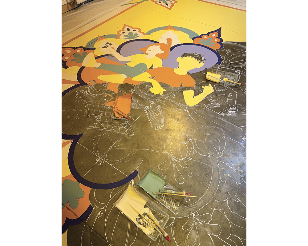Habillage d'espaces sur le sol de la salle de repos du Secours Catholique du 19eme arrondissement de Paris.