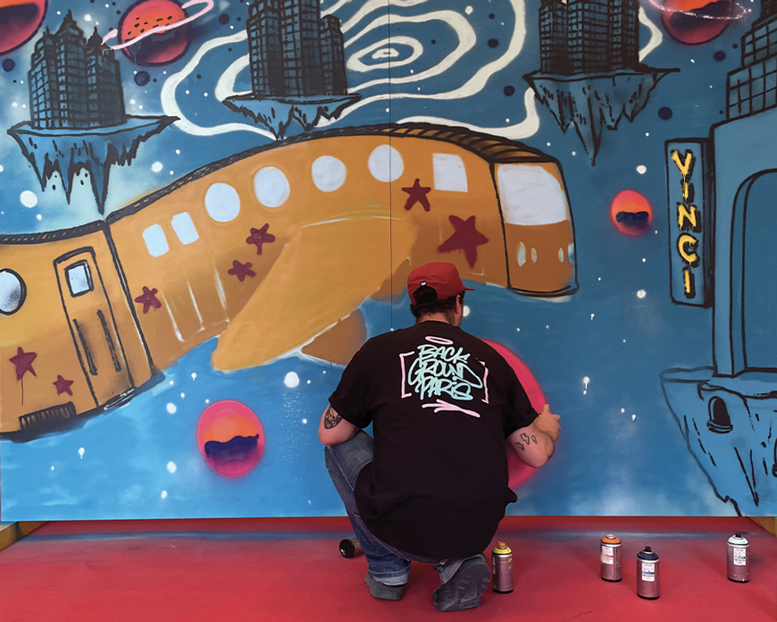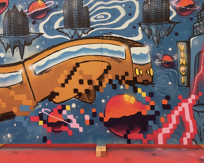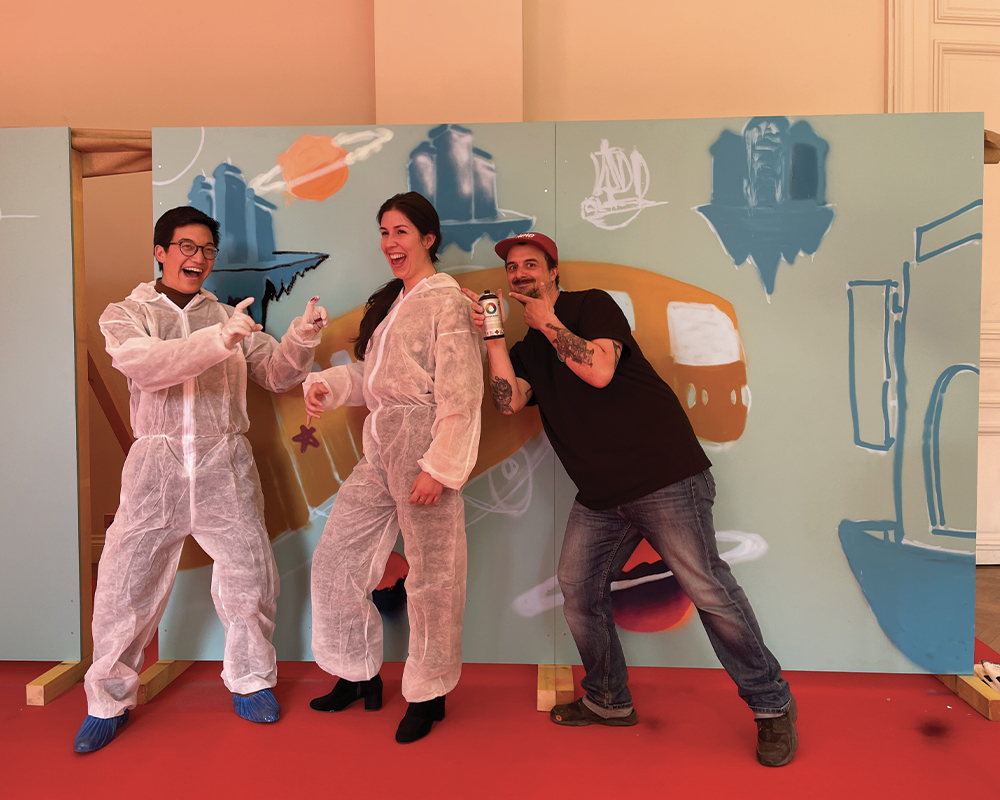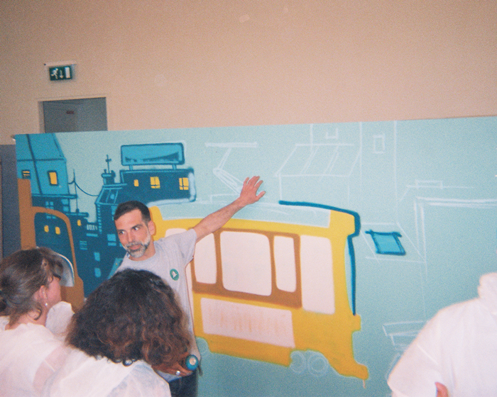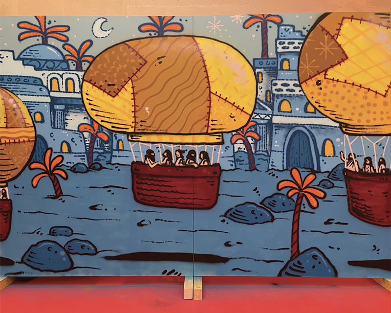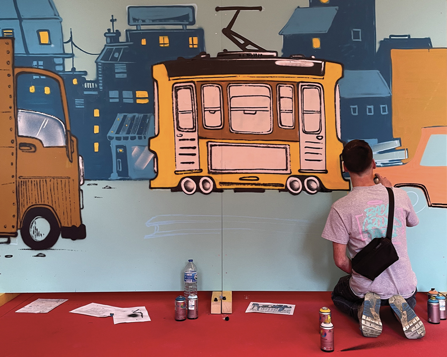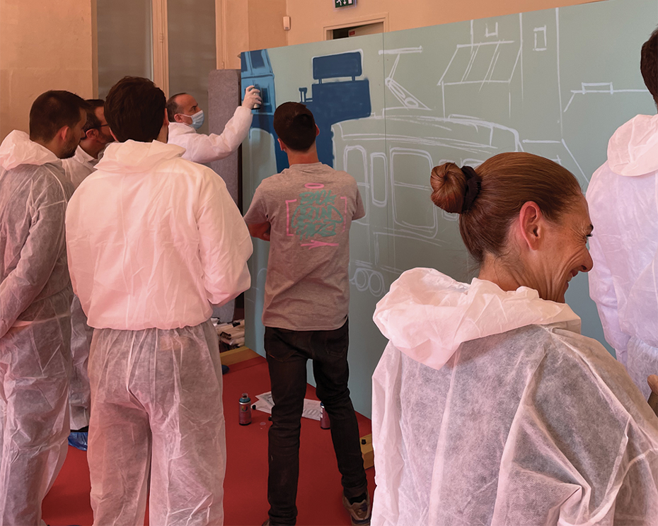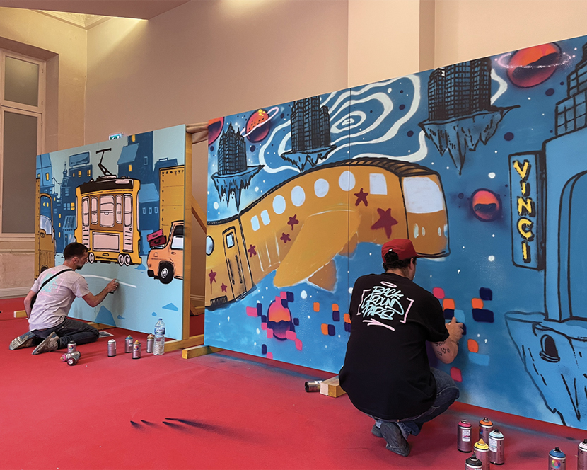 La thématique des peintures : "la mobilité positive" que nous avons traité de manière temporelle. A la manière d'une frise chronologique, les trois panneaux représentent le passé (avec ses ballons dirigeables), le présent (avec le tramway de Lisbonne) et le futur imaginé de cette mobilité positive.